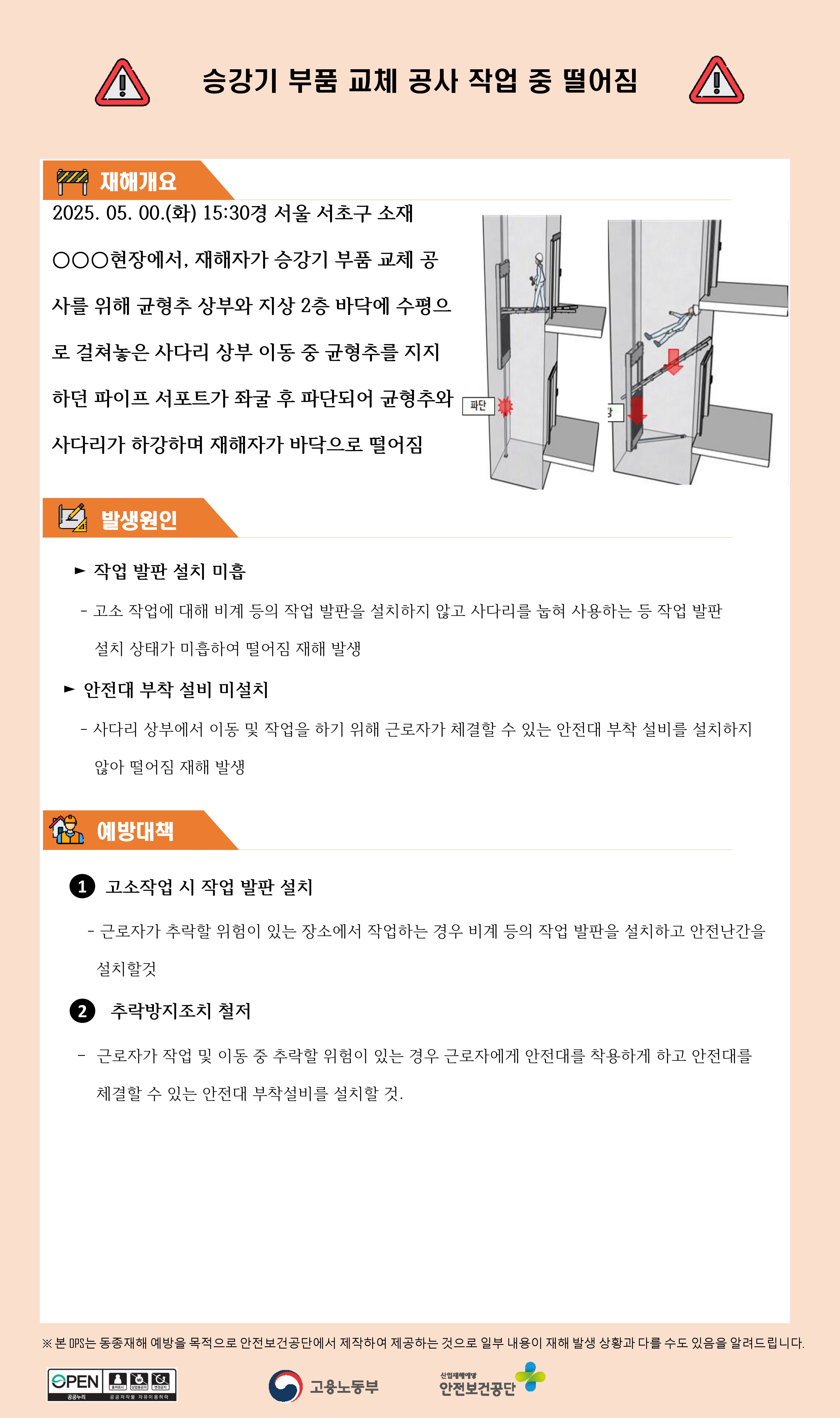 건설업 재해사례 - 승강기 부품 교체 공사 작업 중 떨어짐