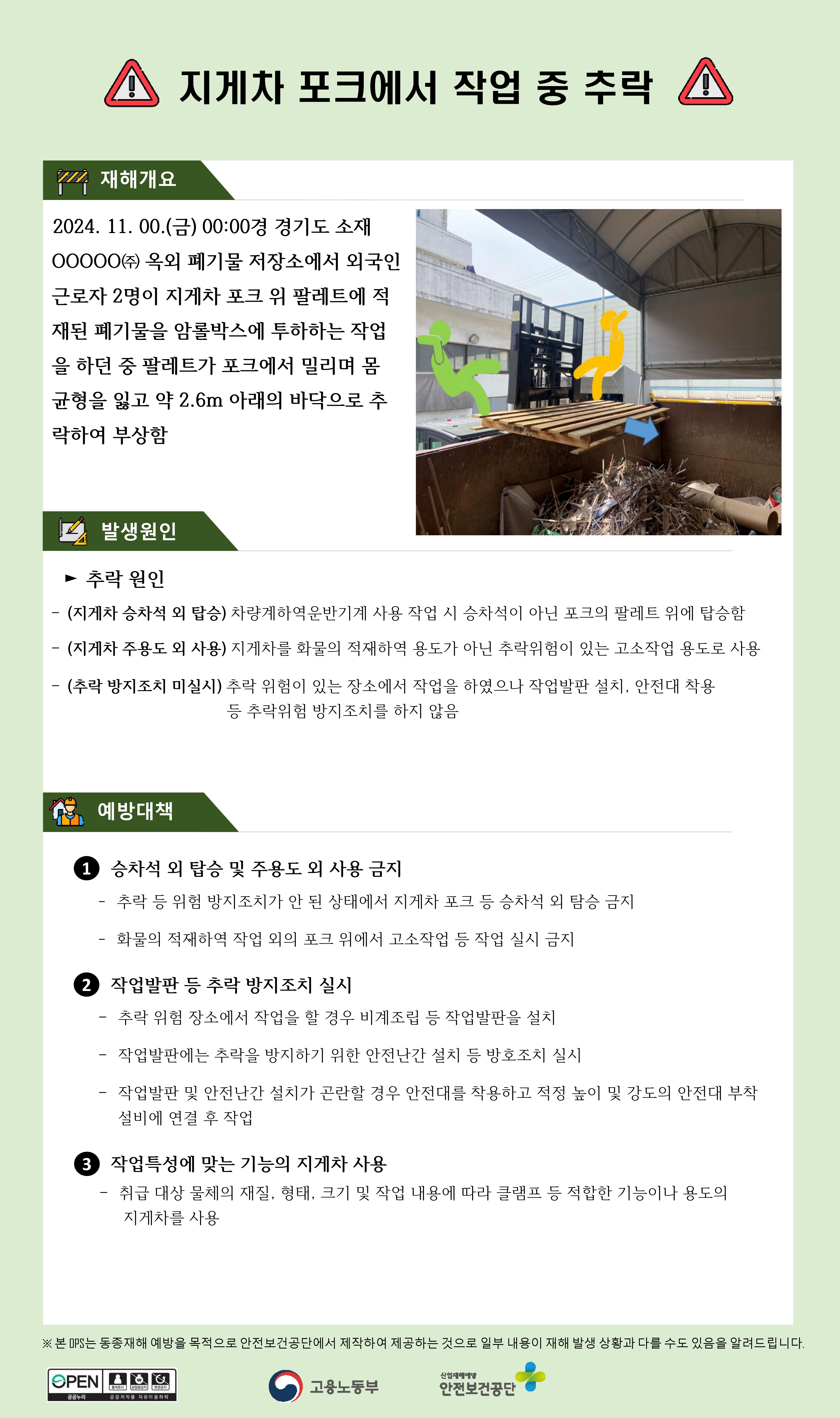 제조업 재해사례 - 지게차 포크에서 작업 중 추락