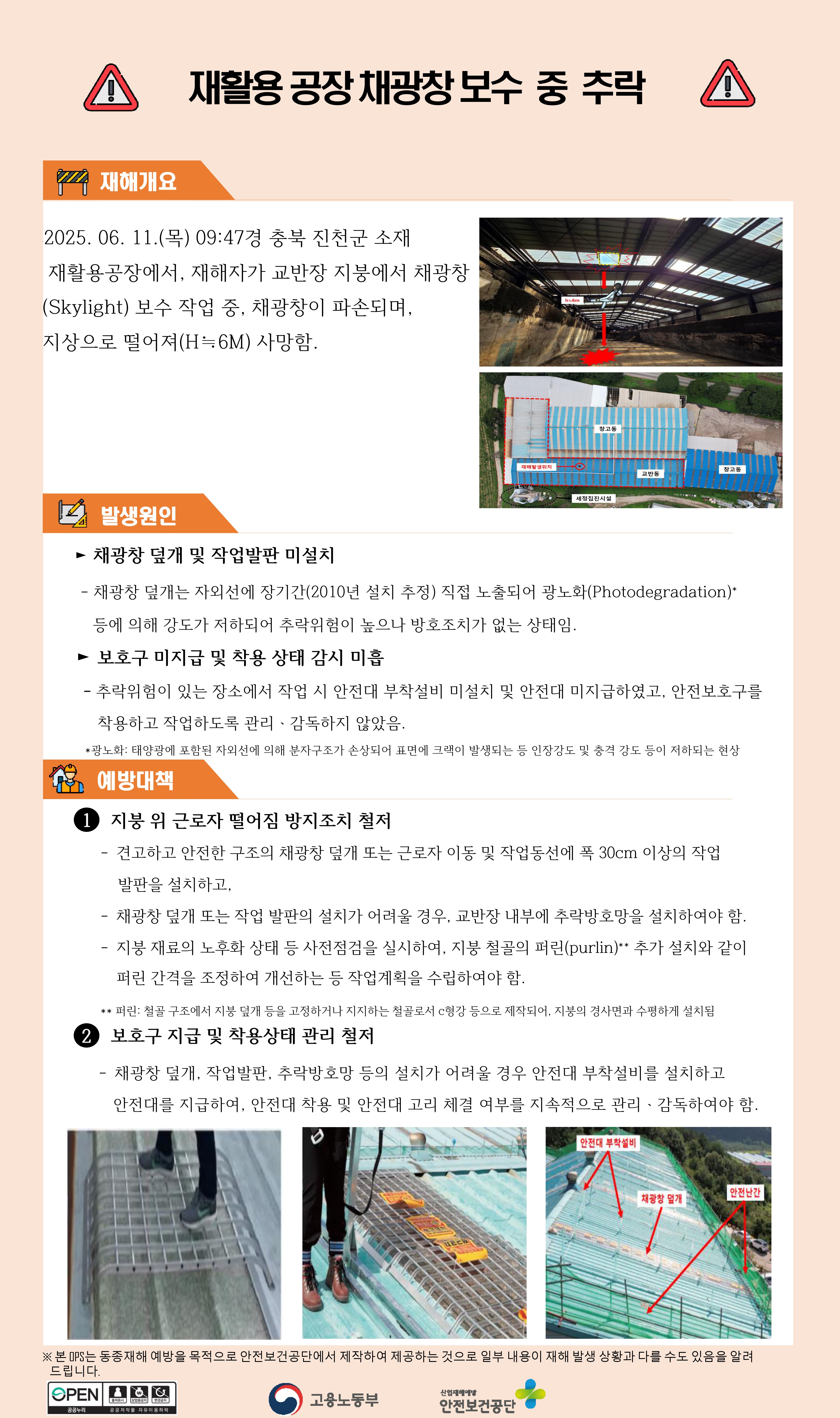 건설업 재해사례 - 재활용 공장 채광창 보수 중 추락