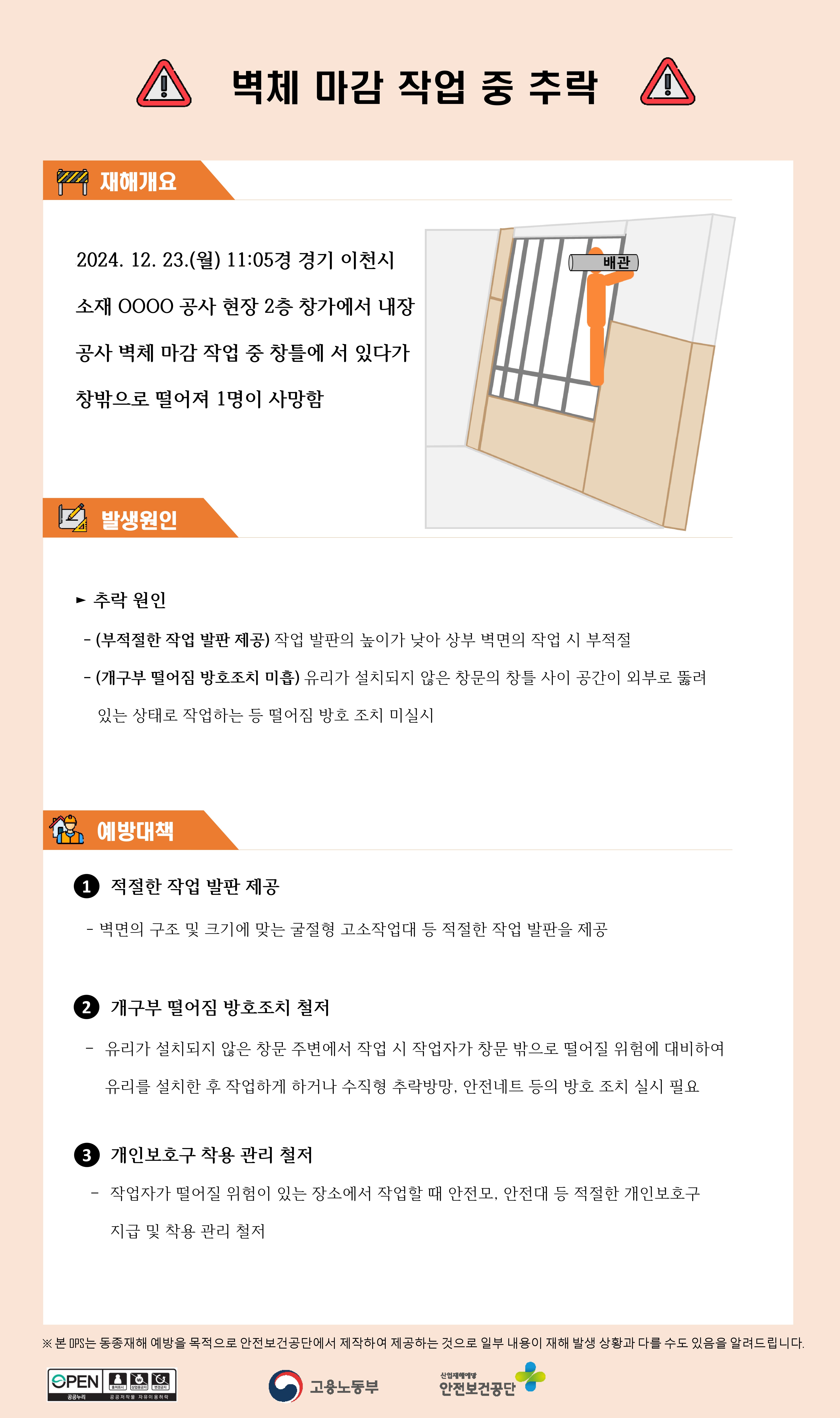 건설업 재해사례 - 벽체 마감 작업 중 추락