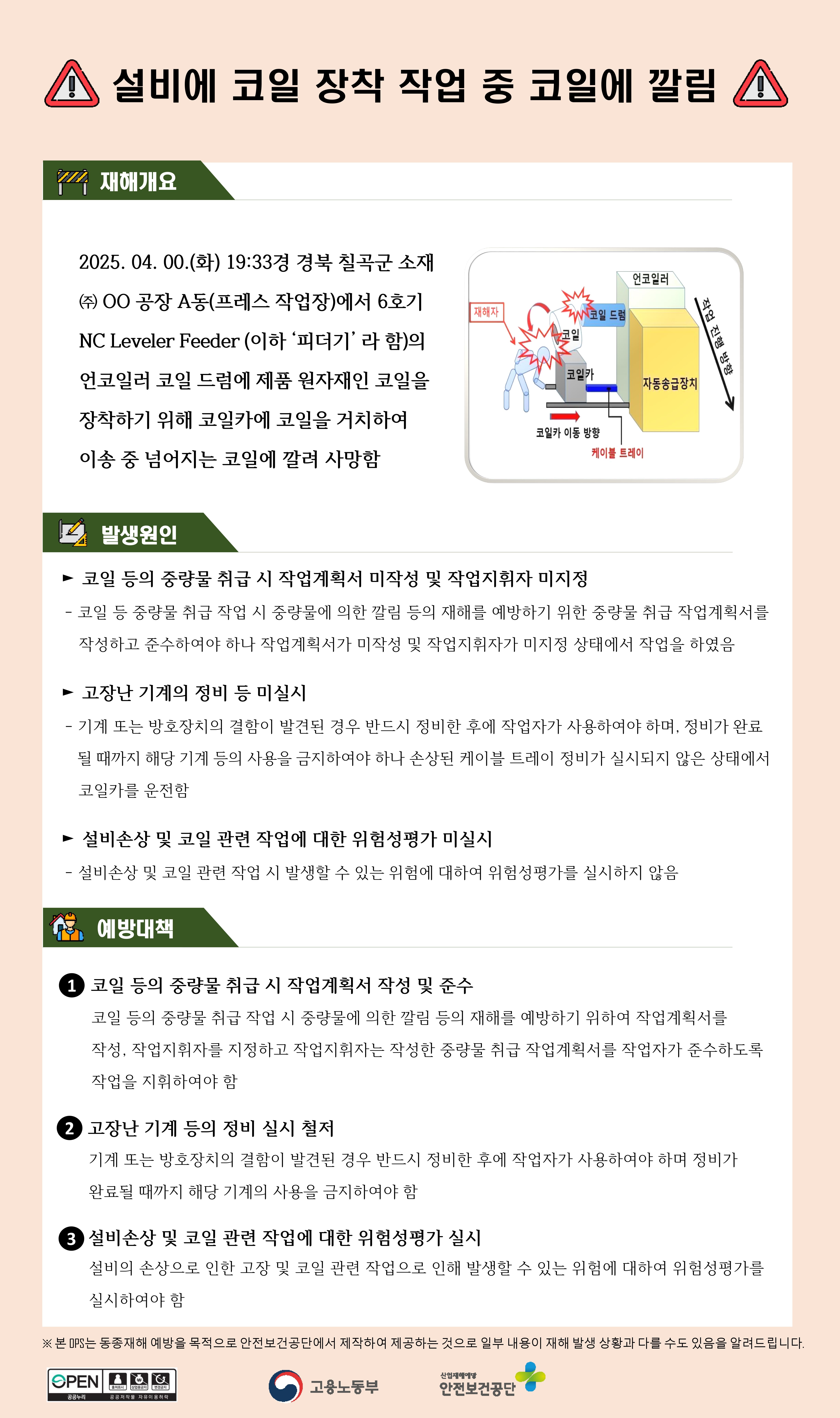 제조업 재해사례 - 설비에 코일 장착 작업 중 코일에 깔림
