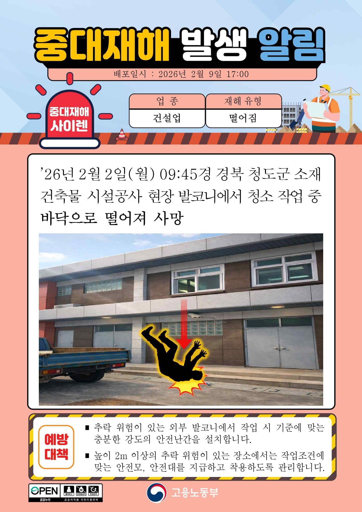 중대재해 발생 알림(떨어짐) - 건설업