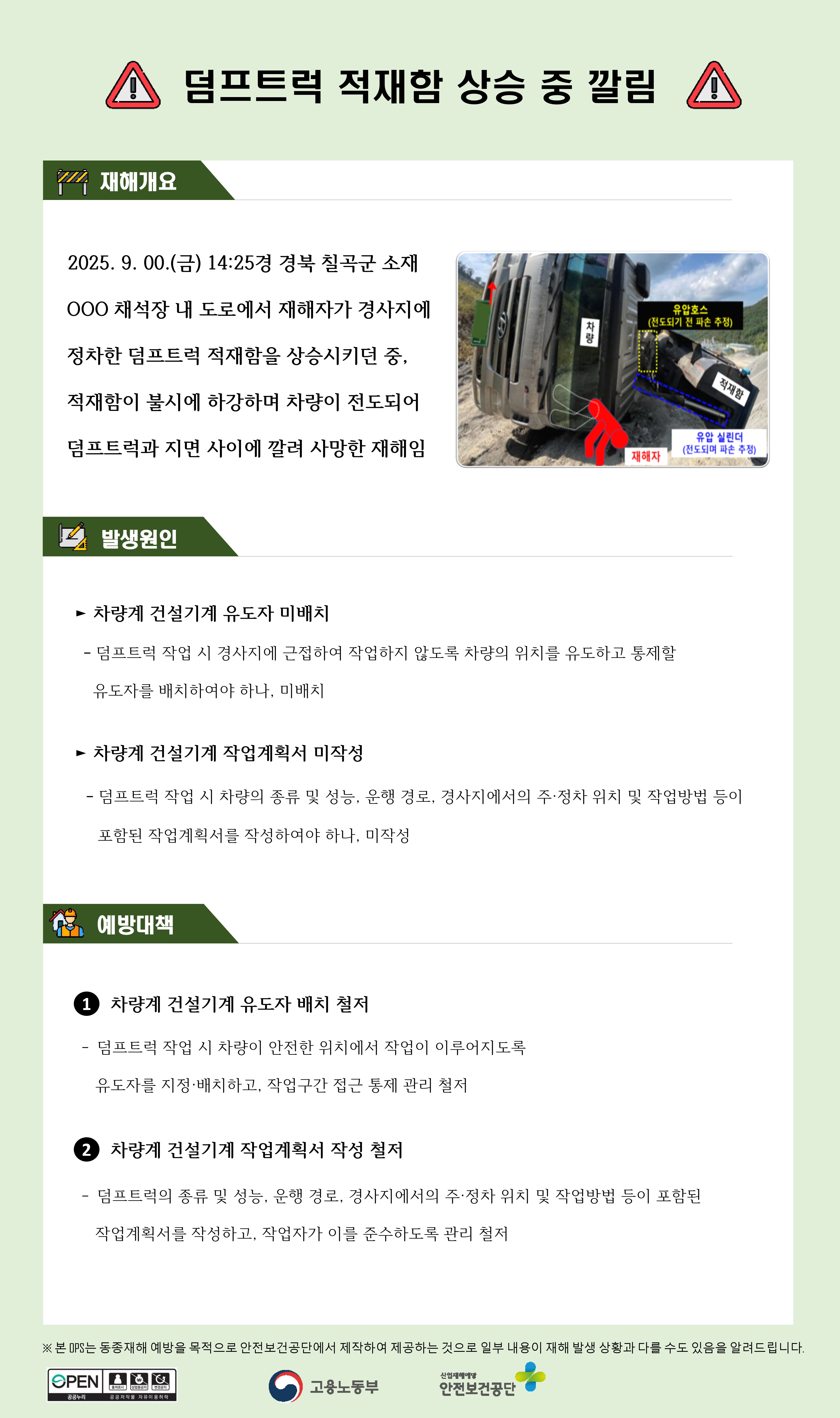 건설업 재해사례 - 덤프트럭 적재함 상승 중 깔림